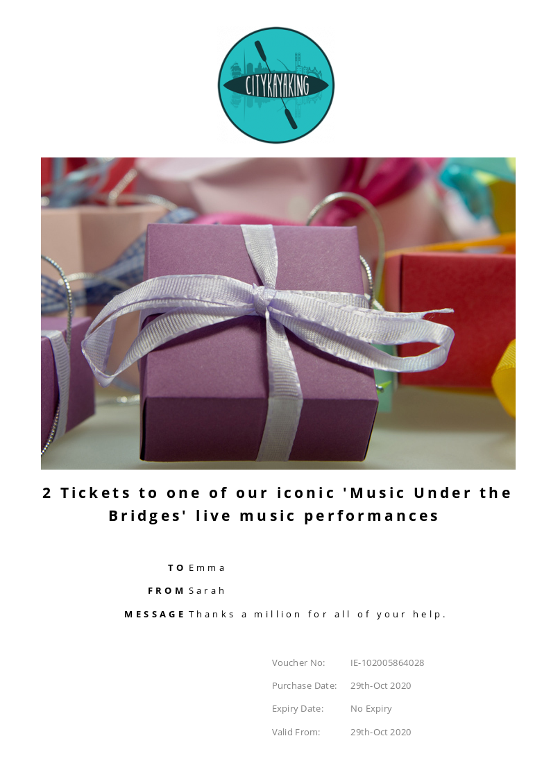A live performance with Music Under the Bridges or a Guided Tour, your recipient decides! All our kayaks are double or triple kayaks.